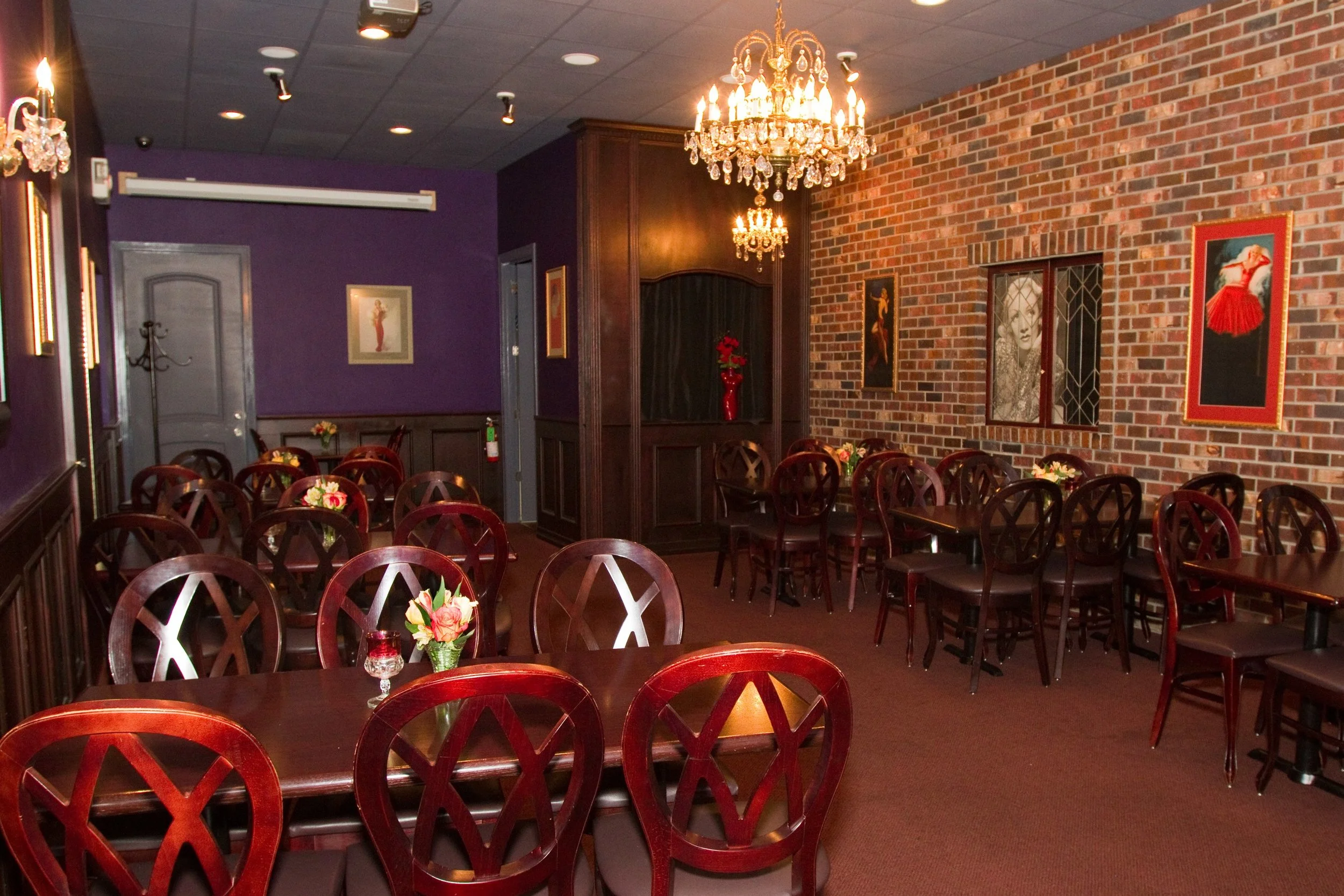 The Chandelier Room has a warm style with dramatic 1930’s original artwork. This room has antique crystal chandelier lighting and with dark mahogany toned tables that are topped with vintage candle holders. The art deco custom designed mirror reflects the timeless images of your event.